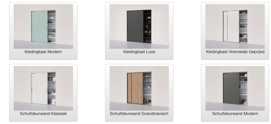 Bepaal hier je schuifdeur model, de kleuren van de deuren, de rails en eventueel bijpassende grepen.